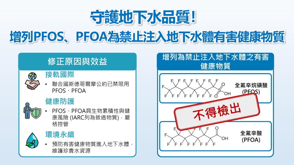 環境部於115年2月23日修正發布「禁止注入地下水體之有害健康物質種類、限值」公告事項第1項附表,將全氟辛烷磺酸(PFOS)及全氟辛酸(PFOA)增列為禁止注入地下水之有害健康物質,限值為不得檢出。 環境部表示,考量全氟及多氟烷基物質(PFAS)在環境中難分解,對健康及環境具危害風險,且國際癌症研究中心(International Agency for Research on Cancer, IARC)已將PFOS、PFOA其列為致癌性物質,基於保護水資源及預防原則,依「水污染防治法」第36條第4項授權規定完成本次修正,作為未來執法參據,以確保地下水水體安全。 環境部提醒「水污染防治法」已全面禁止廢(污)水注入地下水體,若注入之廢水中含有本次公告之有害健康物質,將面臨刑事責任。 本次修正發布相關資料內容請參閱環境部新聞專區下載附加檔案(https://enews.moenv.gov.tw/),或至行政院公報資訊網(https://gazette.nat.gov.tw/egFront/)下載,歡迎各界瀏覽參閱。