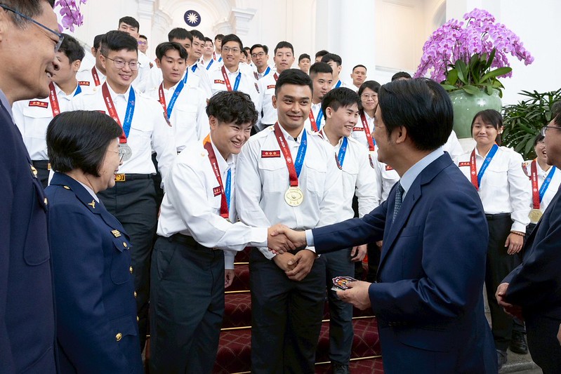 總統接見「2025年第21屆世界警察消防運動會」代表團 賴清德總統今(27)日上午接見「2025年第21屆世界警察消防運動會」代表團,肯定代表團摘下74金、46銀、48銅,締造歷屆最好成績,展現「臺灣尚勇」精神。期盼未來持續發揮專業及實力,積極維護國人生命財產安全,讓社會變得更好。 總統致詞時表示,第21屆世界警察消防運動會今年在美國舉行,有70多個國家、近萬名執法人員參賽,我國警消同仁非常厲害,與各國頂尖好手同場競技,拿下74金、46銀、48銅,總共168面獎牌,締造臺灣歷屆最好成績。並指出,代表團優異表現,展現「臺灣尚勇」精神,讓世界看見臺灣警消人員的絕佳體能和精湛實力,每一位都是「臺灣之光」,要代表國人表達最深的感謝和敬意。 總統指出,「世界警察消防運動會」是警消界奧運會,很高興看到警政署選手在柔道、跆拳道、步槍以及手槍射擊等項目,展現優異警技;消防署選手也在極限消防員、全裝與輕裝爬梯等項目,充分發揮消防搶救及應變能力。這是因為警消同仁平時訓練精實,比賽才能拿下獎牌;「以賽代訓」、「以賽會友」展示臺灣警消應勤技能的優秀水準,更用成績證明臺灣警消的專業及實力,與國際接軌且不斷提升。 總統也感謝內政部長劉世芳、警政署署長張榮興及消防署署長蕭煥章的大力支持,以及所有警消同仁在工作崗位上的努力付出,積極維護國人生命財產安全;每當災害及危險發生時,總是站在第一線,為任務全力以赴。尤其今年颱風接連來襲,不論是防災準備或是災後重建工作都很辛苦,感謝警消同仁的投入,給予民眾最大的協助。同時提到,不是每個超人都有披風,任何致力於讓社會變得更好的人都是英雄,警消同仁都是英勇的超人、社會的英雄,「國家以你們為榮!」。 代表團一行由團長暨內政部警政署副署長廖美鈴率領,內政部長劉世芳、警政署署長張榮興及消防署署長蕭煥章陪同,前來總統府晉見總統,總統府秘書長潘孟安也在座。