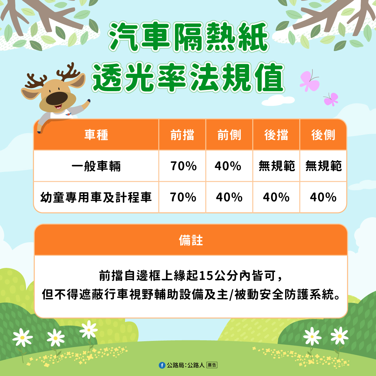 交通部已修正道路交通安全規則第39條及第39條之1,並公告自115年2月28日起實施,自該日起第一次申領牌照的新車適用隔熱紙納管新制,一般車輛若黏貼隔熱紙,前擋風玻璃可見光透過率70%以上、前側窗可見光透過率40%以上,至於計程車及幼童專用車的隔熱紙,前擋70%以上、其餘車窗及後擋風玻璃均為40%以上。 中壢監理站表示,合格隔熱紙產品會有合格標識,該標識有2種方式,一種是業者自行烙印(相關烙印樣式可參考財團法人車輛安全審驗中心之「車輛安全資訊網」合格產品專區),另一種由專業機構印製、財團法人車輛安全審驗中心核發。業者自行烙印的合格標識,其格式由申請者訂定,標識內容至少應包含廠牌、型號及可見光透過率;由車安中心核發的合格標識,應黏貼於車內前擋風玻璃右下角處(從車內方向往外看,副駕駛座側),黏貼張數以1廠牌、1型號、黏貼1張為原則。 汽車隔熱紙法制化管理係以提升道路交通安全為核心理念,兼顧行車安全、車內隱私和隔熱效果,公路局呼籲各車輛車主如有黏貼隔熱紙的需求時,要選用黏貼符合標準規定的隔熱紙,提升駕駛人在駕駛過程中,具有足夠行車視線與清晰的視野,一起打造更安全的行車環境,共同維護提升國內道路交通安全環境。 中壢監理站表示,民眾若有黏貼隔熱紙需求,或是車輛銷售商、隔熱紙安裝商幫車主貼隔熱紙,可至「監理服務網」/「汽車車窗及擋風玻璃黏貼隔熱紙」專區,查詢選用合適的產品型號。