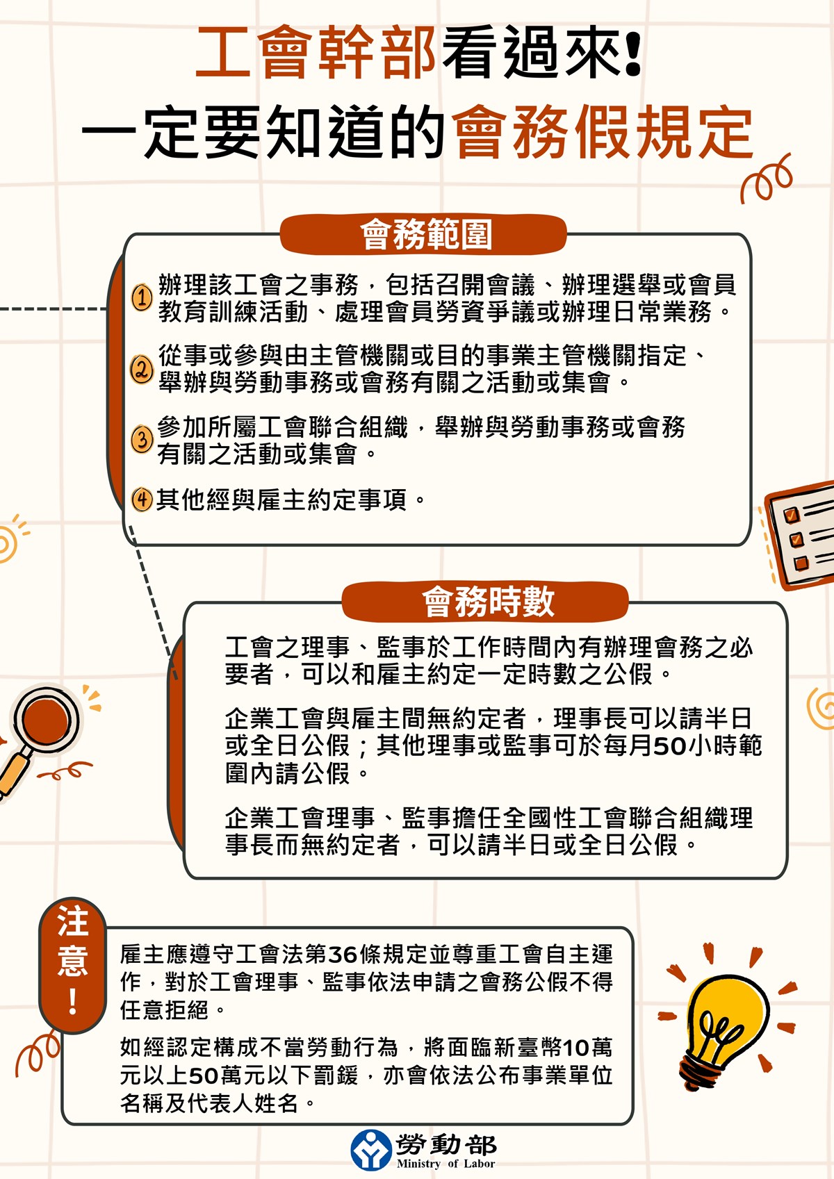 勞動部做出重要函釋,針對工會理事及監事為出席工會向勞動部不當勞動行為裁決委員會(下稱裁決委員會)申請裁決案之審理程序,所需之資料準備及作業期間,雇主應依法給予會務公假。勞動部特別提醒雇主,應恪遵工會法第36條規定並尊重工會自主運作,對於工會理事、監事依法申請之會務公假不得任意拒絕,前開行為如經工會申請裁決,且經裁決委員會認定成立者,將面臨新臺幣10萬元以上50萬元以下罰鍰,亦會依法公布事業單位名稱及代表人姓名,對企業形象產生負面影響。 勞動部指出,工會理事、監事於工作時間內有辦理會務必要者,得依工會法第36條規定請公假;同法施行細則第32條對於辦理會務之範圍亦有規範,例如第1款「辦理該工會之事務,包括召開會議、辦理選舉或會員教育訓練活動、處理會員勞資爭議或辦理日常業務」,工會理事、監事有符合該款事實情形,可以向雇主申請會務公假以處理工會相關事務。 勞動部進一步說明,不當勞動行為裁決機制自100年建立以來,裁決委員會對於案件證據之提供及相關情事細部之調查越趨縝密,工會代表於出席裁決委員會調查及詢問程序時,確需充分準備相關事證,始能提出具體充分之陳述及佐證資料,以提供裁決委員釐清事實進而保障權益。勞動部以往已肯認企業工會理事長出席裁決委員會之調查及詢問程序屬會務之一環,此外,工會之理事、監事為出席裁決審理程序會議,所需進行資料文件準備作業,當亦視為工會法施行細則第32條第1款所定辦理工會事務之範圍。因此,只要工會為裁決案件之當事人,於收受開會通知單後由理事或監事所進行之事證蒐集、整理與陳述準備、書狀撰擬及律師諮詢等作業,得向雇主釋明事由,並依工會法第36條規定請會務公假,雇主則應依法准假。 勞動部呼籲,健全的集體勞資關係有賴工會功能的正常發揮,雇主對於工會理事及監事為辦理工會裁決案件之準備作業,應依法給予會務公假,以實質保障勞工參與工會活動之權益。如果勞資雙方確實因公假有所疑議時,可檢具相關具體事證資料,向工會會址所在地之勞工行政主管機關請求協處,以避免不必要之爭議。